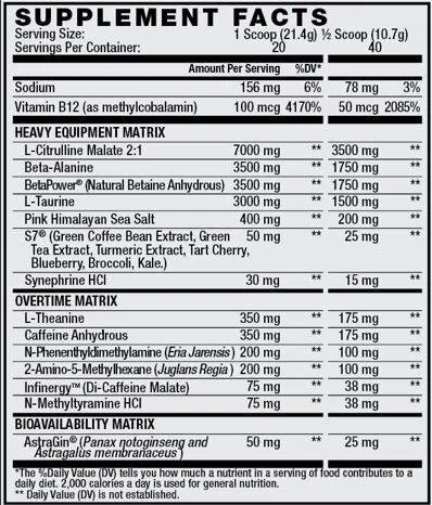 Next let's get into the overtime matrix. First we have a solid dose of L-theanine at 350mg. This is going to be really effective in reducing the jitters and anxiety that can come with these high stim formulas. Next we have caffeine anhydrous at 350mg. Which for me is a really good amount of caffeine, not too little, but enough for it to hit pretty hard. Eria Jarensis is the next one up. This one has been compared regularly to DMAA. Yet while it is similar and can produce solid Euphoria it still is a bit weaker than DMAA, but do not worry the next one up comes pretty close to the old DMAA we loved so much. Next up we have 2-aminoisophetane or DMHA. This to me is extremely close to DMAA and provides me with laser focus and an insane amount of energy. After that we have Infinergy or Di Caffeine Malate which has caffeine combined with malate. The malate helps to effectively minimize potential caffeine crashes. Finally we have the N Methyl Tyramine which is effective for helping increase motivation, focus, and energy levels. The overtime matrix will have you focused, energized, and in a great mood for your workout.